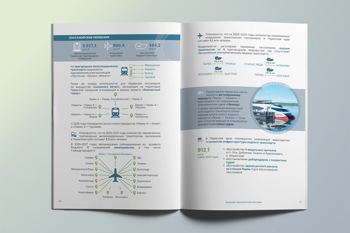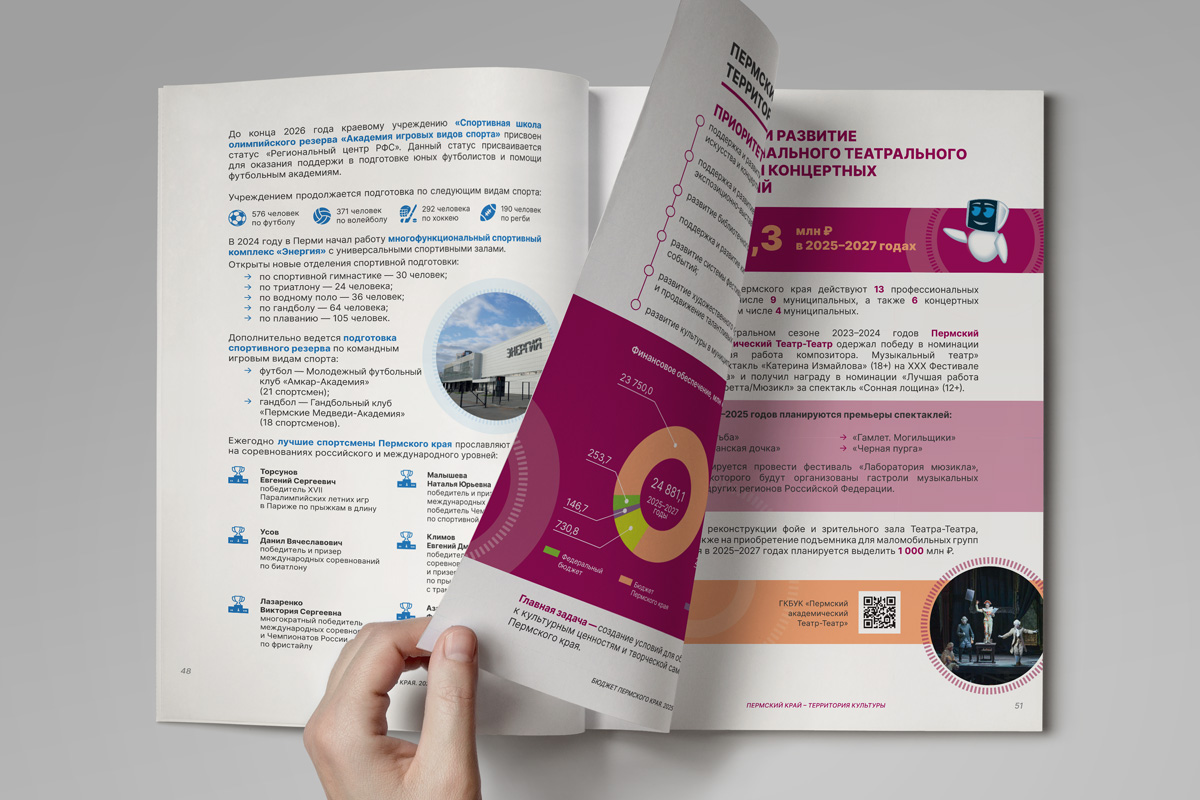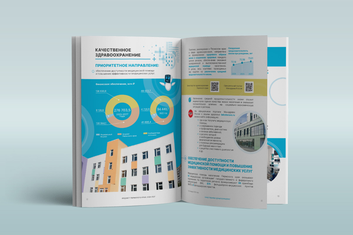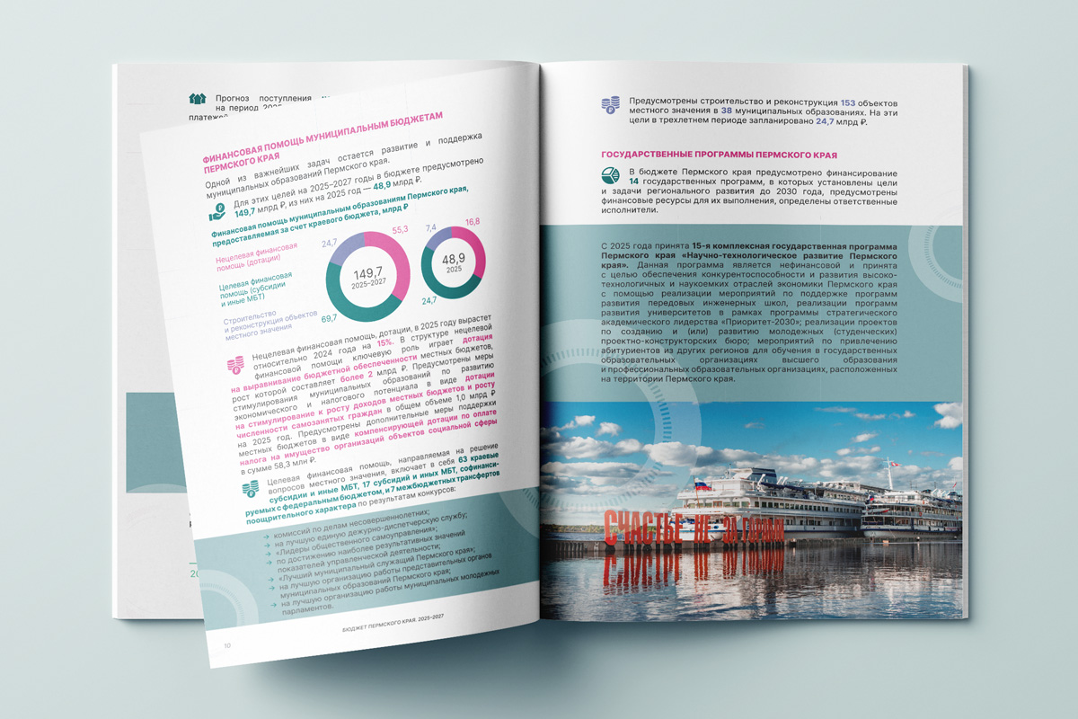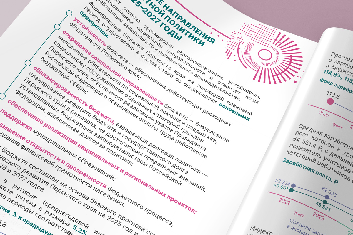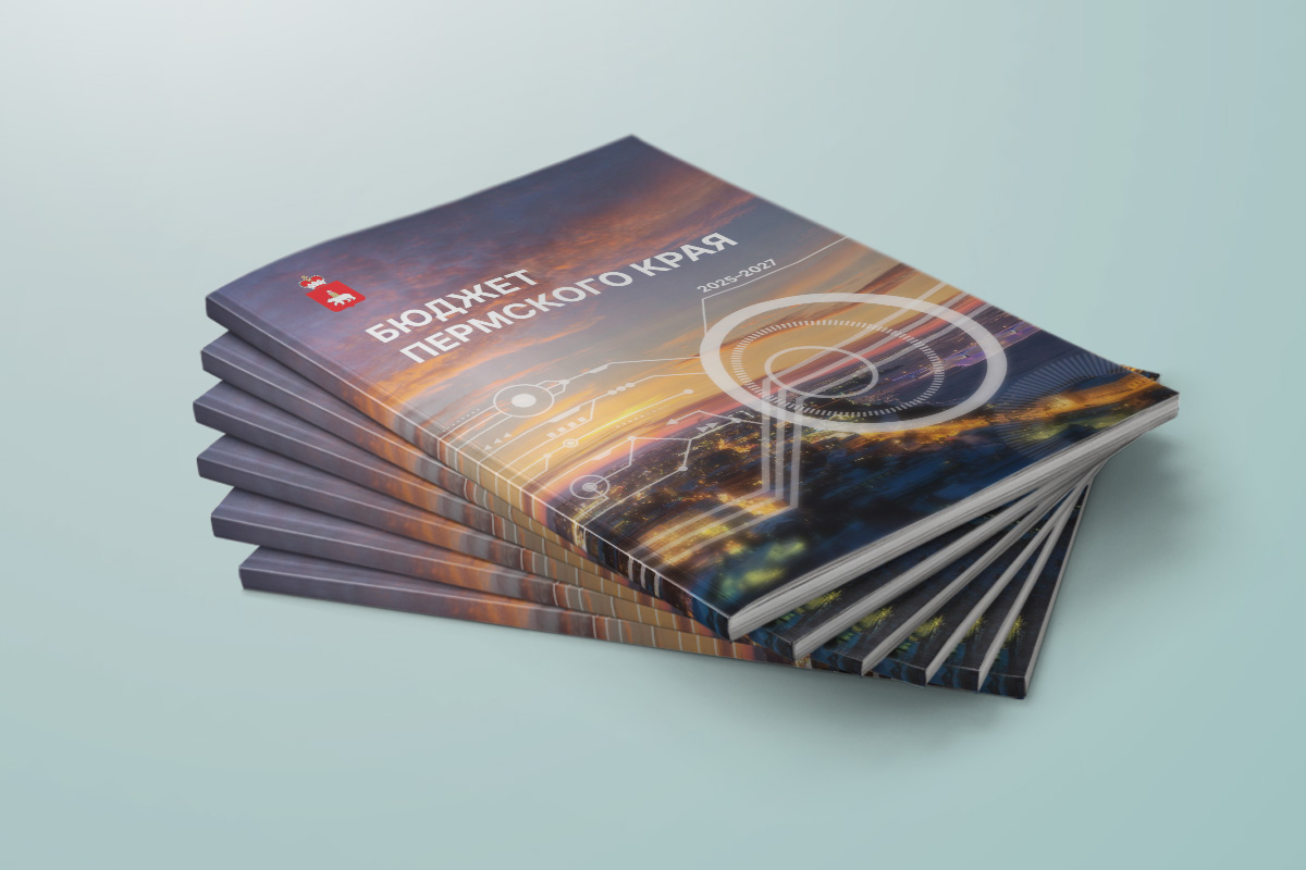Мы разработали стиль оформления, отредактировали и сверстали брошюру для печати и в электронном виде. У издания этого года иная концепция обложки: изображение ночной Перми дополнено технологичным рисунком. Здесь вся «информация» сходится в один «круг», который символизирует целеполагание, концентрацию и внимание к самому важному — жителям Пермского края.